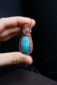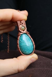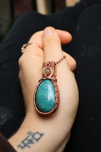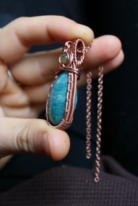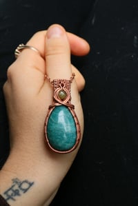 This is a fully hand wrapped copper wire pendant, made with an Amazonite crystal as the center piece, with a green garnet woven into the bail top area. In the pictures you can see the intricate side weaving wrapped around the crystal