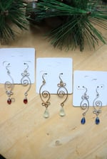 Photo 4 shows the earring made with sterling silver wire, with a faceted red garnet teardrop dangling from the bottom.
