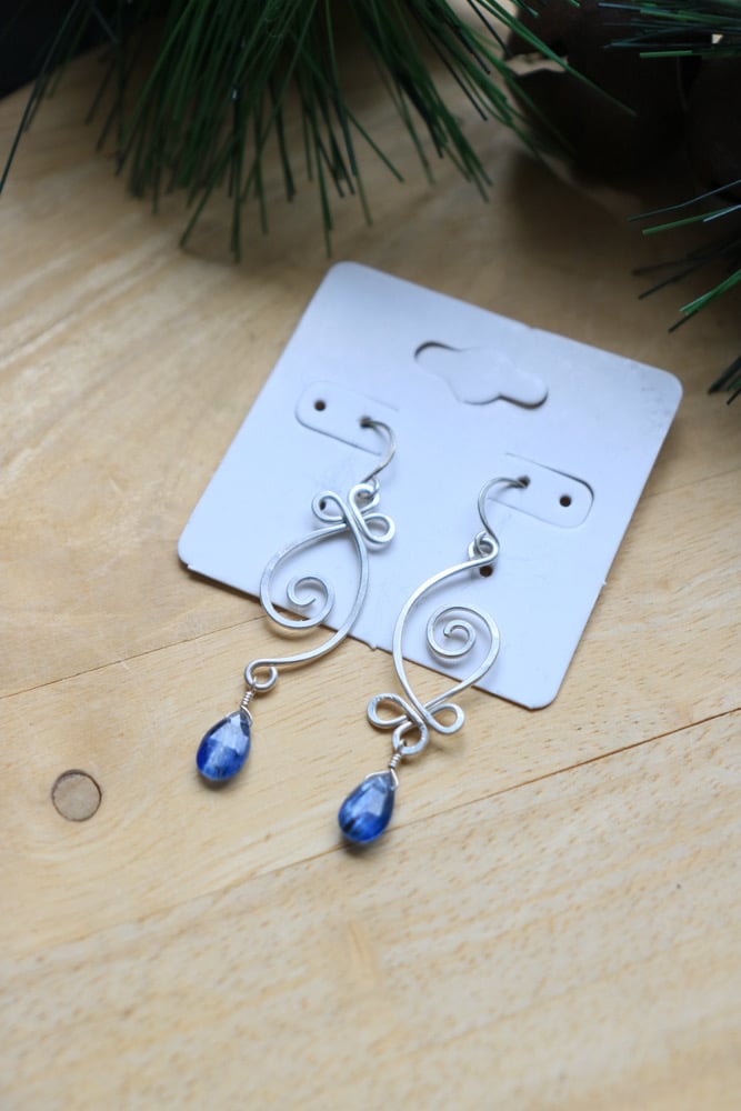Photo 3 shows the earring made with sterling silver wire, with a faceted kyanite teardrop dangling from the bottom.